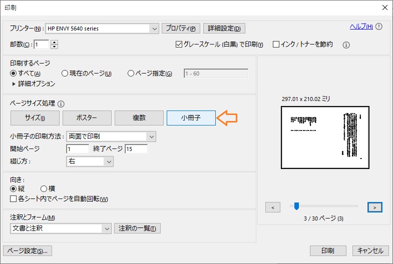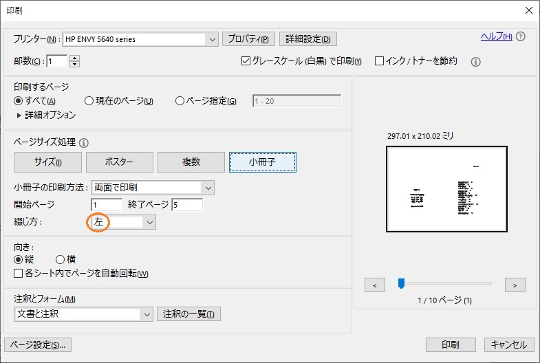 印刷設定でこれは横書きなので左綴じで。